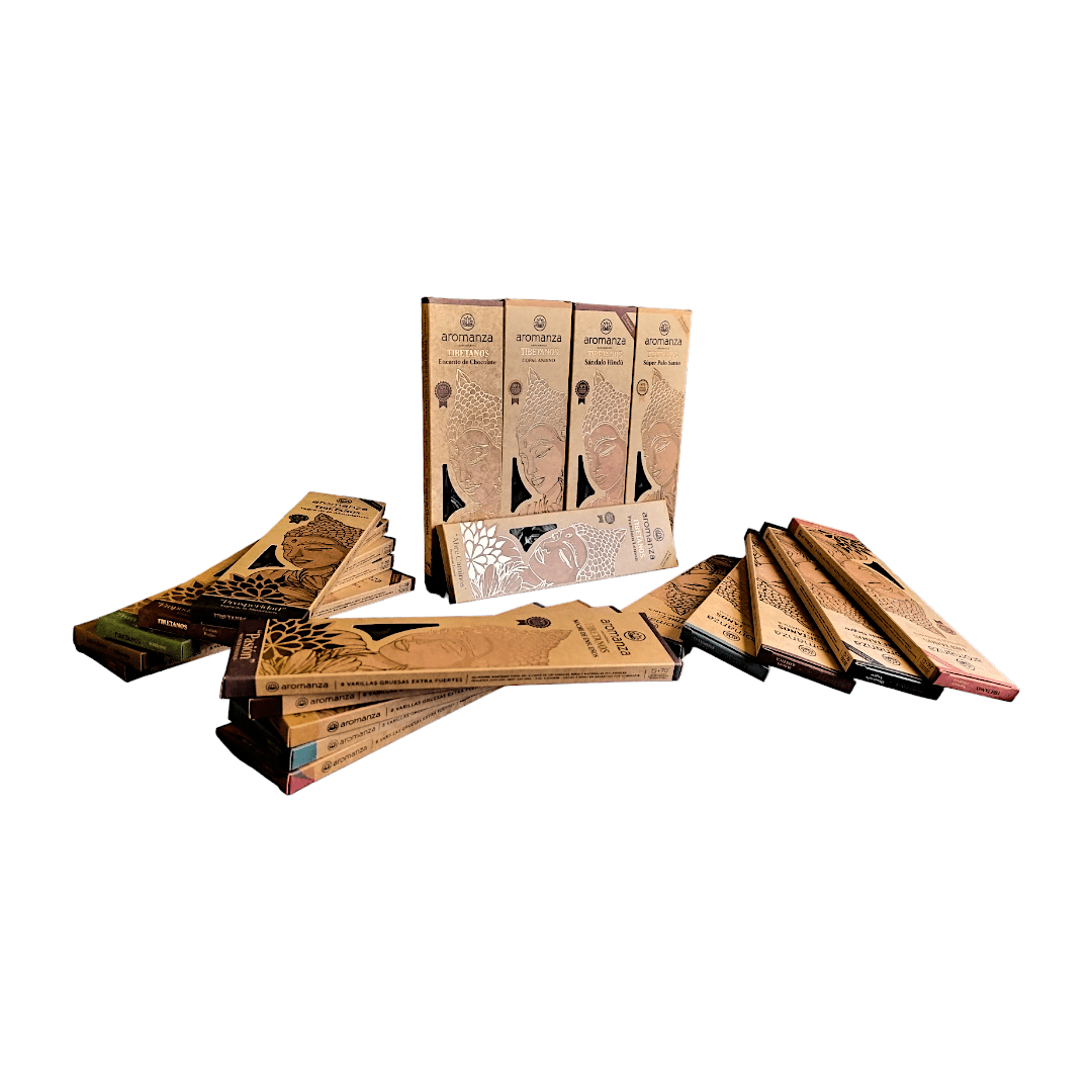 Incienso Consagrado, Super Palo Santo, 7 Poderes, Ébano Marfil, Mirra Consagrada, Rosa Real, Real Champa, Sándalo Hindú, Fragancia Oriental, Naranja Pimienta, Viva La Vida, Dulces Frutillas, Energía Limpia, Frutos Rojos, Atrae Dinero, Esencias de la India, Manzana Canela, Gardenias Flores Blancas, Canela Mística, Lavandas del Valle